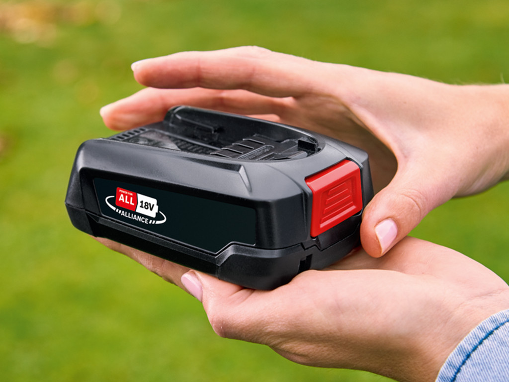 Ein Akku des POWER FOR ALL 18V Akkusystems passt auf alle deine 18-Volt-Geräte von Gardena und anderen Marken, die sich dem System angeschlossen haben, wie Bosch. Du setzt den Akku also zum Beispiel zuerst in deinen Gardena Rasenmäher oder deine Gardena Heckenschere und danach in deine Bosch DIY Bohrmaschine ein.