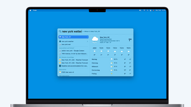 Wie viel ist 78+56? Und 100 Dollar, wie viel Euro sind das wirklich? Ich löse solche Fragen, indem ich Spotlight auf meinem MacBook verwende. Wenn ich die Befehlstaste gedrückt halte und die Leertaste drücke, öffnet sich Spotlight als Suchleiste, in die ich meine Frage eingebe. So löse ich schnell eine Rechnung und überprüfe, wie viel mich der Urlaub in Amerika wirklich kosten wird. Ich schaue auch schnell nach Fußballergebnissen, indem ich den Namen meines Lieblings-Bundesligaclubs eintippe, finde das Wetter in New York und überprüfe meine Flugdaten.