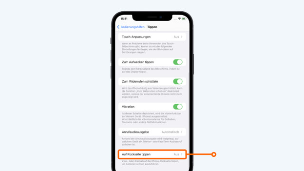 - Tippe auf „Berühren“. Scrolle nach unten und wähle „Auf die Rückseite tippen“.