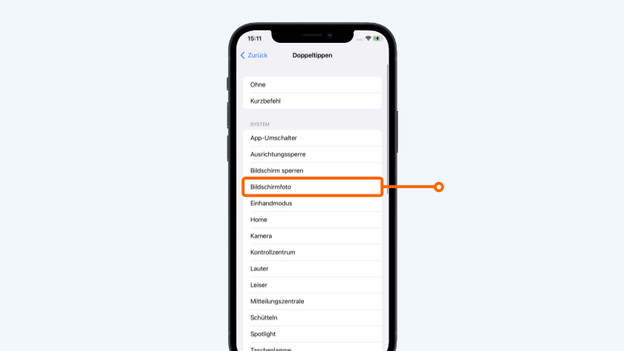 - Wähle „Screenshot“. Ab sofort kannst du auch Screenshots machen, indem du zweimal auf die hintere Mitte deines iPhone tippst.