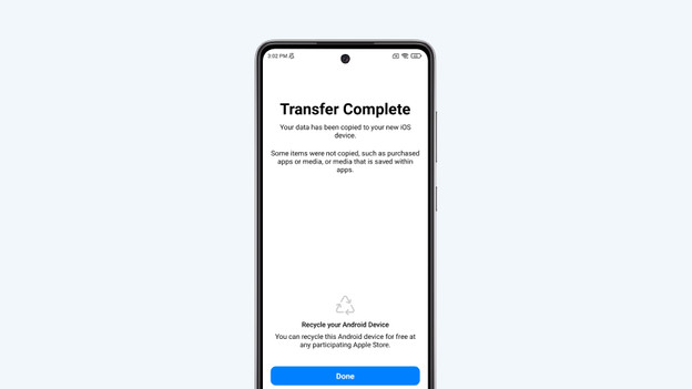 - When the data has been transferred, you'll see 'Transfer completed' on the screen of your Android device. Tap 'Done.