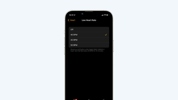 - Choose 'Low Heart Rate'. Enter the minimum amount of beats per minute. Anything below this number means you'll get a notification.