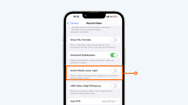 The iPhone needs enough light for the Action mode. If that's not the case, your iPhone will indicate it needs more light. This is how to set up the Action mode in low light: