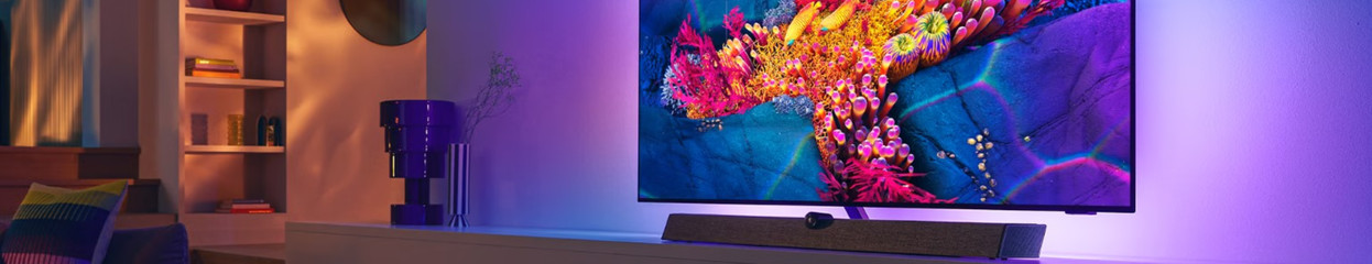Integrated into the edges of an Philips Ambilight TV you'll find rows of LED lamps. Televisions with Ambilight have 3-sided or 4-sided Ambilight. This means the TV lights up 3 or 4 edges. You can set up the TV's lamps via various modes. If you select the screen mode, the LED lamps light up in the colors of the screens. In music mode, the lighting moves along with the action on the screen. For example, the wall colors red from left to right when a red Ferrari races past on the screen.