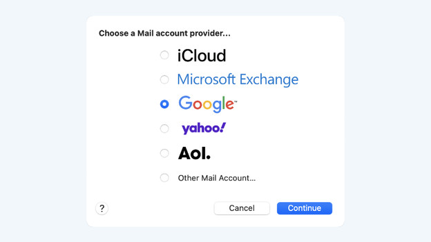 The Mail app can be found in the Dock at the bottom of your screen. In this app, you select the email provider you want to use: