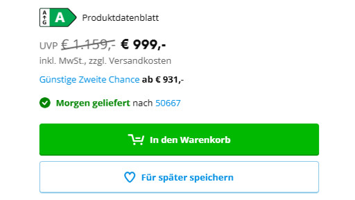 At this time, we only deliver the following white goods and televisions in North Rhine-Westphalia, the greater Frankfurt and Hanover areas, and Hamburg. Our own employees will deliver your product directly to your house in a blue delivery van and install it for you if necessary: