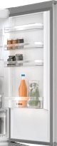 What immediately strikes me is the refrigerator's sleek design. The silver door looks great in my kitchen. I wipe the front and see the first fingerprint, which I easily wipe away with a cloth. The refrigerator compartment is spacious and has three adjustable shelves. Thanks to the flexible interior, I can easily adjust the refrigerator's layout. If I have a large carafe of mint water, I can easily remove the shelves. This way, I don't have to cram everything in.
