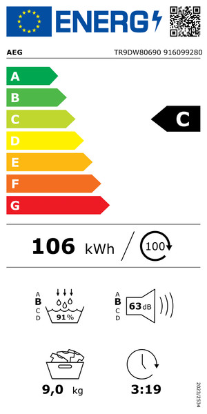 With the AEG TR9DW80690 heat pump dryer, you can carefully and energy-efficiently dry your clothes. Thanks to the SensiDry technology, your clothes dry at low temperatures. The AbsoluteCare Plus system adjusts the drying temperature and the spinning speed to the laundry. This way, your laundry stays beautiful for longer whether you dry bedding or your favorite blouse. The ProSense load sensor adjusts the drying time to the blouse, so you can wash a small amount of laundry quicker. With a 9kg load capacity, you can even dry large loads of laundry in one go. This is especially practical if you have a larger household.