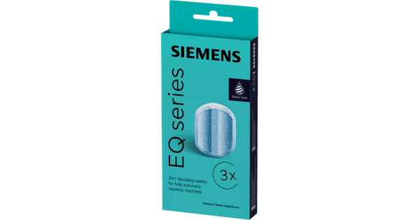 In the Siemens Maintenance Pack, you'll find all the maintenance products you'll need to maintain your Siemens fully automatic machine for half a year. This pack contains 3 water filters, 3 descaling tablets, and 10 cleaning tablets. With the water filter, you largely prevent limescale and filter limescale particles from the water. For the best results, change the water filter every 2 months. With the descaling tablets, you'll remove the layer of limescale that has formed in the pipes of your machine. You can descale your machine 3 times with the descaling tablets. Finally, you can clean coffee grease and oils from the brew group with the cleaning tablets. You receive 10 cleaning tablets. When you keep up with the maintenance, your machine will remain in great condition. Suitable for the Siemens EQ3, EQ5, EQ6, EQ7, EQ8, and EQ9 series
