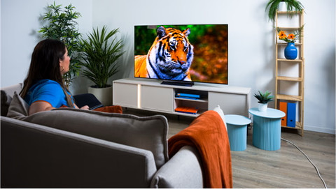 Überlege gut, welche Bildschirmgröße zu dir passt, wenn du einen LG OLED-Fernseher auswählst. Auf einem zu kleinen Fernseher siehst du wenige Details, aber ein zu großer Fernseher macht deine Augen müde. Welche Größe zu dir passt, hängt davon ab, wie weit weg du vom Fernseher sitzt. Wir empfehlen beispielsweise 55 Zoll große Fernseher erst ab einem Sitzabstand von zwei Metern.