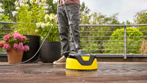 Löse mit einem leistungsstarken Flächenreiniger Schmutz und Moos von der Terrasse.