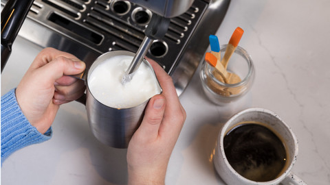 Wir erklären dir, wie du Heimbarista wirst. So dürfen beispielsweise Kaffeemühle, Tamper, Milchkännchen und Ausklopfschalen nicht fehlen.Milch mit einer Dampflanze aufschäumen