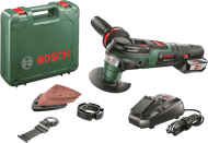 Das Bosch AdvancedMulti 18 ist ein Multifunktionswerkzeug, das mit einem 18-Volt-2,5-Ah-Li-Ion-Akku arbeitet. Das ist nützlich, wenn du an einem Ort arbeiten möchtest, an dem du keine Stromversorgung hast. Du hast auch die Möglichkeit, einen zusätzlichen Griff für mehr Halt und Kontrolle zu montieren. Dieser Griff dämpft die Schwingungen, was das Arbeiten angenehm macht. Du bekommst drei Aufsätze direkt mitgeliefert: ein Tauchsägeblatt zum Aussägen von Formen, ein Segment-Sägeblatt für verschiedene Sägearbeiten und ein Schleifpad mit Schleifblättern zum Schleifen. Sei dir bewusst, dass nur Aufsätze mit einer Bosch Starlock-Verbindung verwendet werden können. Der Tiefenanschlag verhindert, dass du beim Schneiden zu tief in das Material eindringst. Mit dem AdvancedMulti 18 kannst du somit verschiedenste Aufträge ausführen.