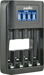 Mit dem Jupio USB Battery Fast Charger LCD mit vier Schächten ist ein schnelles Ladegerät für vier AA- oder AAA-Batterien. Die LCD-Anzeige zeigt den Batteriestatus an. Dank USB-Anschluss lädst du deine Batterien beispielsweise am Laptop auf. Das ist praktisch, wenn keine Steckdose in der Nähe ist.