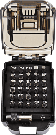 Das Makita Schraubbit-Set 31-teilig B-68317 wird in einer Akkuverpackung geliefert. Nicht nur schön zum Verschenken, sondern auch praktisch. Hast du eine Makita-Mbox? Dann nimmst du dieses Set einfach an der Stelle, an der die Akkus sitzen, mit. Das Set besteht aus einem 1/4" magnetischen Schnellwechsel-Bithalter und 25-mm-1/4"-Form-C-Bits in verschiedenen Größen und Passungen, wie Philips, Inbus, Torx, Pozidriv und Schlitz.