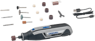 Leicht, kompakt und einfach zu bedienen: Das macht das Dremel Lite 7760 aus. Mit diesem Multitool erledigst du alle Arten von leichten Heimwerker- oder Kreativaufgaben wie Schleifen, Schneiden, Gravieren, Reinigen und Polieren selbst. Dank des schlüssellosen Aufsatzwechsels wechselst du problemlos das Werkzeug und arbeitest ohne Zeitverlust weiter. Durch den Akkubetrieb bist du nicht an Verlängerungskabel gebunden und arbeitest sowohl drinnen als auch draußen. Das Lite 7760 dreht sich mit nicht weniger als 8000 bis 25000 Umdrehungen pro Minute. Mit dem Adapter und dem USB-Kabel lädst du das Gerät problemlos auf.