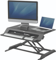 Auf der breiten Plattform der Fellowes Corsivo Sitz-Steh-Workstation Schwarz ist genug Platz für zwei Monitore. Wenn du mit einem Laptop arbeitest, ersetzt du einen der Monitore, sodass du immer noch zwei Bildschirme hast. Auf der unteren Ebene richtest du eine Tastatur und eine Maus ein, um bequem zu arbeiten. Die obere Ablage hat einen zusätzlichen Schlitz, in dem du dein Smartphone bequem unterbringst. So hast du alle wichtigen Arbeitsmaterialien an einem Ort. Die Höhe lässt sich einfach mit der Gasfeder einstellen. Du stellst die Workstation auf die ideale Arbeitshöhe auf bis zu 41,5 cm für deine Körpergröße ein. Eine ergonomische Körperhaltung ist wichtig, um das Risiko körperlicher Beschwerden zu reduzieren.