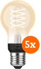 Mit diesem Philips Hue White Standard Filamentlampe E27 5er-Pack verleihst du deiner Wohnung eine Smart-Beleuchtung mit einer klassischen Ausstrahlung. Das Vintage-Design der Lampe in Standardform sorgt in jeder Wohnung für ein gemütliches Feeling. Diese Lampen schenken warmes, weißes, dimmbares Licht. So kannst du immer die richtige Lichtstärke passend zu einer bestimmten Situation auswählen. Die Lampen lassen sich mit Bluetooth bedienen, mit einer Bridge lassen sie sich jedoch auch mit deinem WLAN-Netzwerk verbinden. Mit dieser Bridge holst du zusätzliche Möglichkeiten aus deinen Hue-Lampen heraus. So kannst du die Lampen außer Haus bedienen und festgelegte Abläufe einstellen. So kannst du beispielsweise einstellen, dass sich die Lampen automatisch einschalten, wenn du nach Hause kommst.