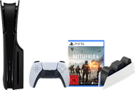 Lade deinen Controller auf und spiele erste Spiele mit der PlayStation 5 Slim. In diesem Set ist ein zusätzlicher weißer Sony DualSense Controller enthalten. Fertig mit Zocken? Dann lädst du den DualSense Controller in der Ladestation wieder auf. So spielst du in der nächsten Gaming-Session wieder mit vollem Akku. Mit der PlayStation 5 Slim mit Laufwerk bringst du dein Spielerlebnis auf ein höheres Level. Diese PlayStation 5 hat ein CD-Laufwerk, sodass du nicht nur zockst, sondern auch Blu-Ray-Filme abspielst. Die PS5 Slim ist 30 Prozent kleiner als ihre Vorgängerin. Dadurch nimmt sie auf deinem Schreibtisch oder neben deinem Fernseher weniger Platz in Anspruch. Außerdem hat die Slim einen Speicherplatz von 1 TB, während die originale PlayStation 5 einen Speicher von 825 GB bietet. Dank des leistungsstarken Grafikprozessors in dieser Konsole spielst du in 4K-Auflösung bei einer maximalen Bildwiederholfrequenz von 120 Hertz. Die SSD sorgt für 20-mal schnellere Ladezeiten in Spielen als bei den Vorgängerversionen der PlayStation-Konsolen. Spielst du viele RPG- oder Shooter-Games? Mit 3D-Audio hörst du genau, aus welcher Richtung deine Gegner kommen. Im Spiel steuerst du deine Charaktere mit dem mitgelieferten DualSense Controller. Dieser verfügt über ein spürbares Feedback und Trigger-Effekte, weswegen du nicht nur siehst und hörst, sondern auch fühlst, was in deinem Game passiert.