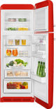 Der SMEG FAB30RRD6 ist eine rote Kühlgefrierkombination mit Energieeffizienzklasse C. Du sparst mit diesem Gerät bis zu 510 Euro an Energiekosten über seine Lebensdauer. So hast du eine Kühlgefrierkombination im 50er-Jahre-Look und kühlst trotzdem sparsam. Der Kühlbereich hat zwei Ablageflächen, auf denen du deine Einkäufe verstaust. Um Platz für einen großen Suppentopf zu schaffen, nimmst du die Ablageflächen einfach heraus. Fleisch und Fisch bewahrst du dank der besonders kalten Schublade länger auf. Die Temperatur darin bleibt ständig um den Gefrierpunkt herum, was für frischen Lachs besser ist. Darunter befindet sich eine Schublade für Gemüse und Obst. Der Gefrierteil oben eignet sich mit einem Fassungsvermögen von 72 Litern zur Aufbewahrung von einem Brot, etwas Eis am Stiel und Tiefkühlsnacks. Dank des abgedeckten Kondensators bleibt die Rückseite des Geräts staubfrei und du hast wenig Arbeit mit der Pflege deiner Kühlgefrierkombination.