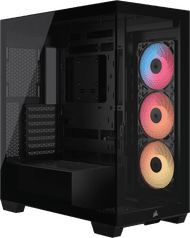 Das Corsair 3500X RS-R ARGB Schwarz ist ein Midi-Tower ATX-Computergehäuse mit RGB-Beleuchtung. Das 3500X RS-R hat eine durchsichtige Gehäusewand. Diese besteht aus gehärtetem, getöntem Glas, sodass du all deine Komponenten siehst. Das PC-Case besteht aus mattschwarzem Metall, was ihm eine hohe Bauqualität und gute Lüftung verleiht. Im Gehäuse befinden sich drei installierte Lüfter. Darüber hinaus baust du für eine gute Lüftung bis zu zehn bis zu 120 mm große Lüfter ins Gehäuse ein. Dieses Computergehäuse verfügt außerdem über zwei Slots für 3,5-Zoll-Festplatten und zwei Slots für 2,5-Zoll-SSDs. Das Gehäuse hat zwei USB-A-3.2-Anschlüsse und einen USB-C-Anschluss. Darüber schließt du einfach deine Peripheriegeräte an. Im Inneren des Gehäuses hältst du dank des Kabelmanagementsystems Ordnung.