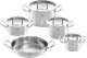 Mit dem Fissler Original-Profi Collection Topf- und Pfannenset 5-teilig + Servierpfanne 28 cm bereitest du jeden Tag komplette Mahlzeiten zu. Das Set umfasst vier Kochtöpfe und eine Servierpfanne. Dank der Maßangabe misst du Flüssigkeiten mühelos ab. Hast du viele Gäste? Mit den vier Kochtöpfen kochst du eine komplette Mahlzeit mit mehreren Gängen oder Beilagen auf einmal. Mit der Servierpfanne servierst du am Tisch Gerichte direkt aus der Pfanne. Das gesamte Topf- und Pfannenset ist aus Edelstahl und für Induktion, Glaskeramik-Kochfelder, Elektrokochfelder, Gas und den Backofen geeignet. Der dicke Edelstahlboden verteilt die Hitze gleichmäßig, sodass Kartoffeln, Soßen und Gemüse gut durchgaren.